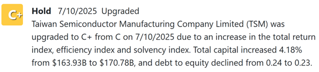 Our ratings system upgraded TSM to “C+” on July 10 after its last earnings release. The reasons included higher total returns, more capital on hand and a decline in its debt-to-equity ratio.