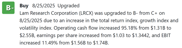 - Three, Lam appears to be in a very ideal position to keep capturing that market. That’s because it’s doing very well financially … all factors that went into its recent rating upgrade.