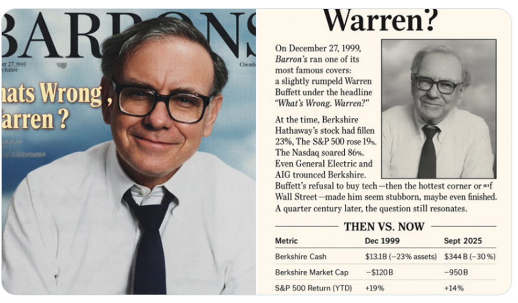 A now infamous December 1999 Barron’s cover story jokingly asked, “What’s Wrong, Warren?” after Berkshire Hathaway lost 23% versus an 86% rise for the Nasdaq.