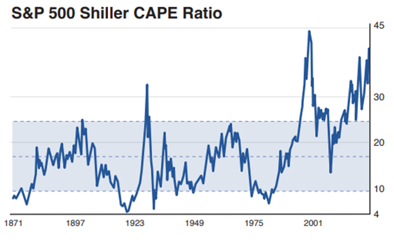 You will see the same basic thing if you look at another well-established measure that goes back to the Dot-Com Bubble days — Robert Shiller’s cyclically adjusted price-to-earnings ratio, commonly called the CAPE.