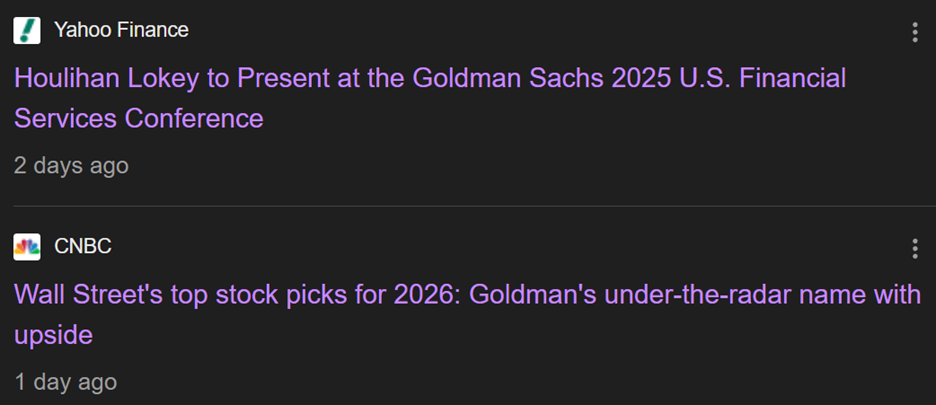 You see, the day after this pick came out, Goldman announced that Houlihan Lokey will be presenting at Goldman’s Financial Services Conference today.