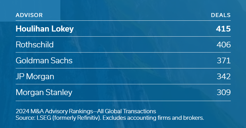 But Houlihan DOES handle the most M&A traffic. At least, by number of deals. (Goldman leads in deal value.)
