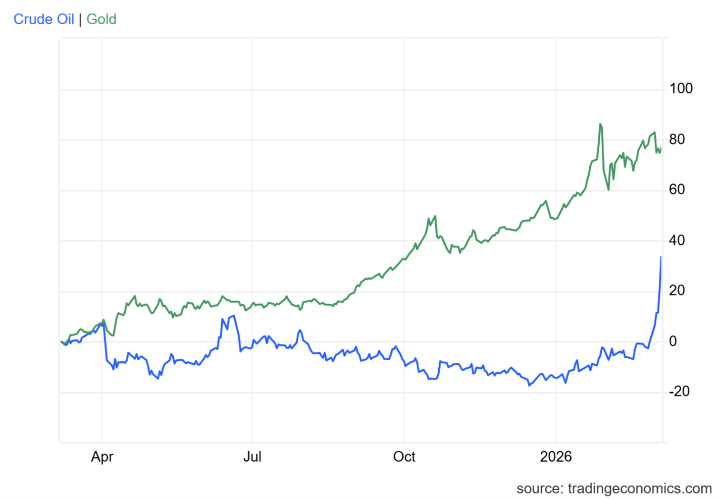 Here’s a one-year chart of oil and gold prices: