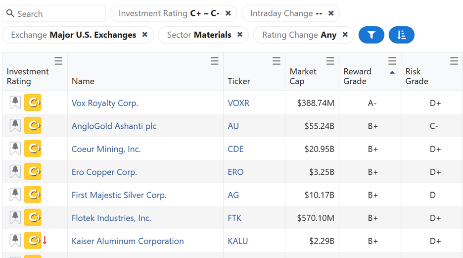 So, I filtered for mining and material companies that fall into our “Hold” category by their Reward Grade.