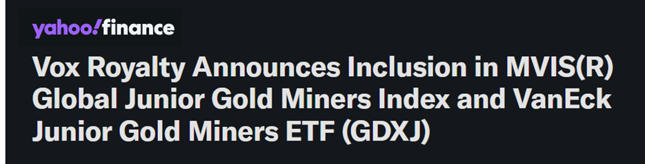 Finally, VOXR got another recent boost. It was just officially added to the VanEck Junior Gold Miners ETF (GDXJ).