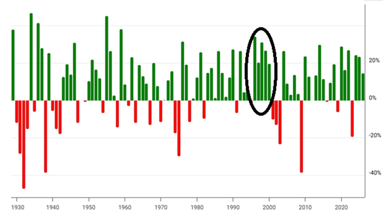 The last time that happened was from 1995-99, with gains of 34%, 20%, 31%, 29% and 19%.