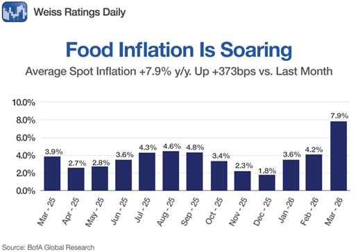 Average spot inflation for U.S. food and beverages surged 7.9% year-on-year. That’s a staggering jump from 4.2% the previous month.
