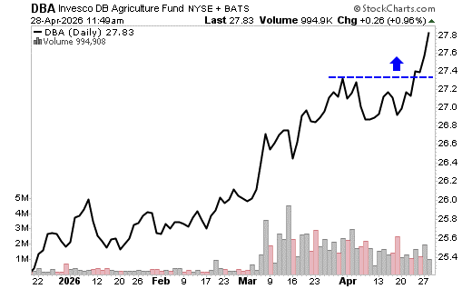 With a breakout like that, the DBA is headed to $35 a share, and probably higher.