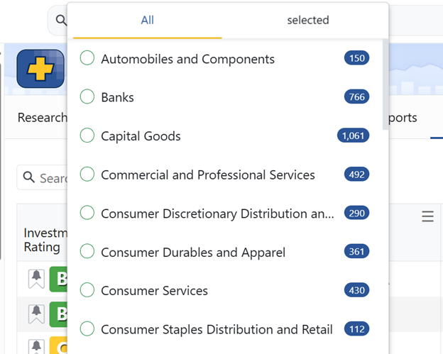 Your Stock Ratings Analyst tool lets you filter by Industry.