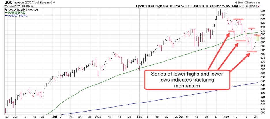 The S&P 500 and Nasdaq-100 just printed a rare bearish pattern: three consecutive lower highs and lower lows.