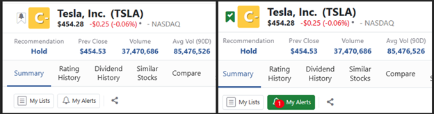 Set up alerts on stocks you want to buy or sell simply by typing in their ticker (e.g., TSLA) and clicking on the gray flag to the left of their Weiss rating.